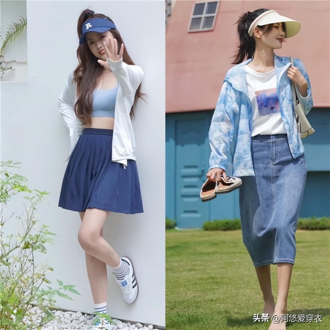 穿防曬衫搭配半身裙,基本上還是會讓我們的部分肌膚展現出來,比如說下半身瘦的女生可以穿短裙配短款的防曬衫,把你的大長腿給體現出來,腰細的姐妹也可以在穿防曬衫時配短內搭,露出腰身,降低沉悶感,增加露膚度。