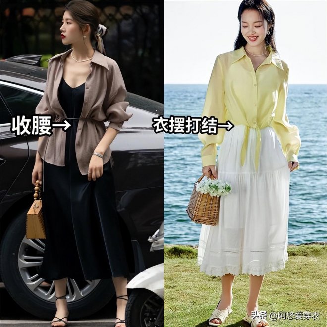 比如下面這些防曬開衫,版型都是比較寬鬆的,雖然材質輕薄,但如果不收腰的話,仍然會顯得比例55開,所以在衣擺打結,而且重點把腰身最細的地方給收縮起來,這樣的搭配才能顯高顯瘦。