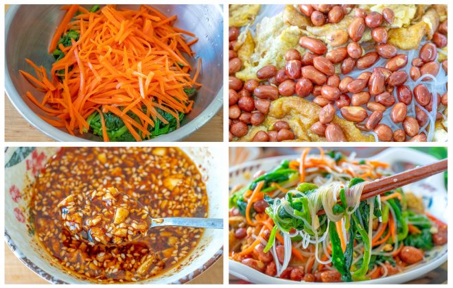 食材:100克花生米、3個雞蛋、1勺澱粉、少許清水、1個細粉絲、1把菠菜、1個胡蘿蔔、白芝麻、蒜末、熱油、生抽、香醋、辣椒油、鹽、糖