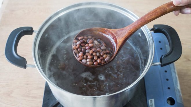 接著直接倒入鍋中加清水煮,大火煮開後轉小火繼續煮6分鐘,然後關火后蓋上鍋蓋,燜至溫度降至溫熱后再打開鍋蓋繼續煮,煮至鍋里的水滾開後轉小火繼續煮6分鐘,然後再關火蓋上鍋蓋燜至溫度降至溫熱,一直重複相同動作約5次,直到紅豆酥軟但不破皮就可以了;
