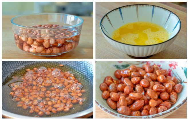 1、先準備100克花生米,洗凈后控干水分。碗里打入3個雞蛋、1勺澱粉、少許清水,攪拌均勻備用。起鍋倒油,涼油下花生米炸,小火慢慢地炸,看到表面顏色變深,表皮有百分之八十的開口的時候關火。立馬撈起來,用花生米的餘溫讓它徹底地熟透,放在一旁晾涼備用。