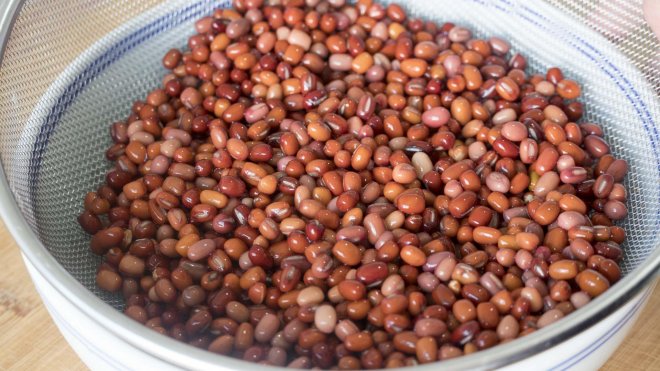 1、我們先來做蜜紅豆,250克紅豆清洗乾淨后加水泡一夜,泡好后倒出來瀝干水分