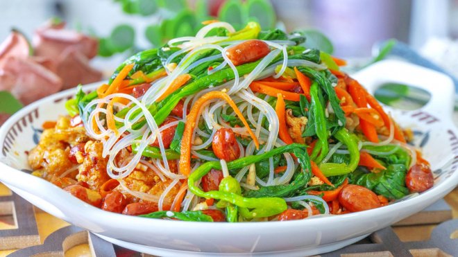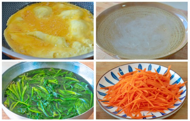 2、鍋里留點底油,倒入蛋液后,用小火煎到一面定型后翻另一面。兩面都定型后炒成小塊兒出鍋,然後先裝起來。接著準備一個細粉絲,用開水燙熟。再準備一把菠菜和一個胡蘿蔔,菠菜加水多清洗幾遍,洗乾淨后把葉子都掰開掰散。胡蘿蔔削皮后切細條。