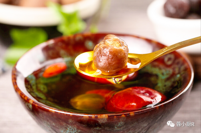 5、茶喝完之後,剩下的配料也不要浪費,桂圓吸飽了水分特別好吃,肉質柔韌中帶有點嚼勁,紅棗吸飽了水分,咬上一口,甜甜的還爆汁。