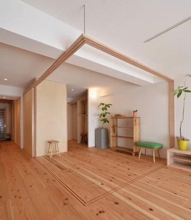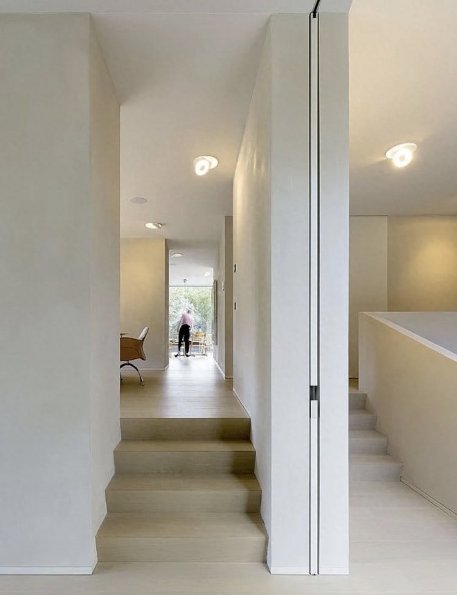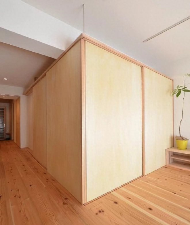 如果你睡眠很容易被噪音影響,且走廊兩側是卧室的話,也可以考慮給走道入口處裝上口袋門,晚上睡覺時,關起來,隔絕客廳噪音,白天隱藏起來,也不影響來回走動。