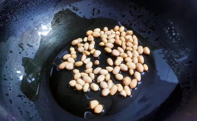 第三步:起炒鍋,鍋中加入少許食用油,接著將涼油倒入一小碗花生米,然後開小火慢炒,將花生米炒熟,直到花生米發出霹靂啪拉的聲音,就可以盛出來放入碗中晾乾,備用。