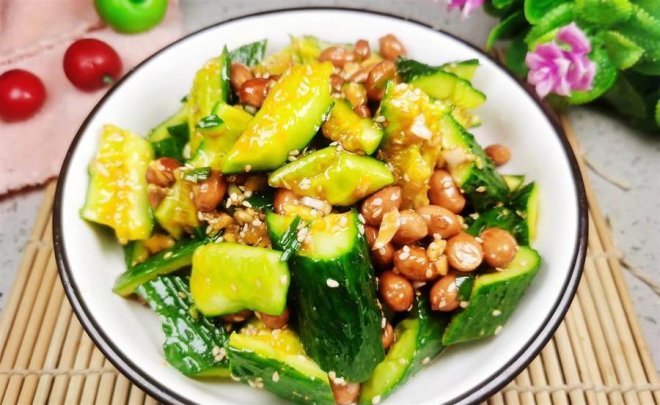 第六步:將醃好的黃瓜水倒掉,接著再將調製好的醬汁倒在黃瓜上面,然後再將晾乾的花生米也倒入碗中,最後將碗中的黃瓜翻拌均勻,即可上桌開吃。這道涼拌黃瓜就做好了,脆爽可口,開胃解膩,做法簡單,大家一起來做哦!