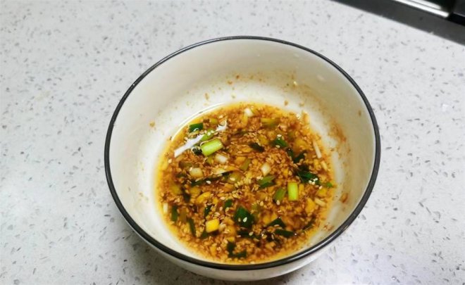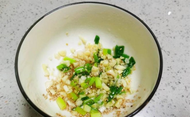 第四步:取一空碗,碗中放入蒜末、香蔥段和一勺白芝麻,接著起鍋燒油,待油溫冒煙後,將熱油淋入食材上面,激發出香味,然後用筷子充分攪拌均勻,備用。