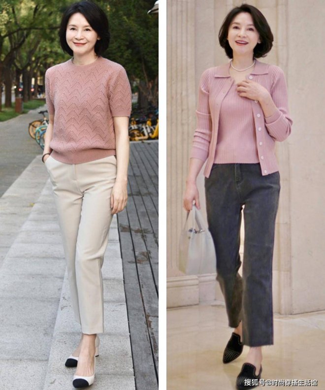 粉色搭配的時候以基礎款,簡約搭配為主,因為粉色本身就自帶減齡效果了,所以在選擇款式的時候不宜再有「蕾絲」「蝴蝶結」等少女感元素,或者搭配的太過俏皮,過猶不及,太多的減齡元素堆砌反而有種強行裝嫩的感覺。像上圖這樣簡單的毛衣搭配直筒褲,或者開衫搭配牛仔褲就溫婉顯氣質。