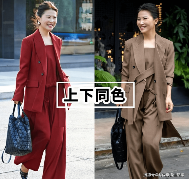 穿的顏色好看還不行,我們同時需要藉助妝容來和我們的穿搭配色去匹配上,這樣的話才能進一步提氣色,像這些上年紀的中年女人,如果穿一些艷麗色彩的服裝,但卻素顏出鏡,難免就會覺得很疲憊,這時候畫上一個精緻的妝容立馬就不一樣了,精氣神有所提升,和穿搭呼應也更顯潮流感。