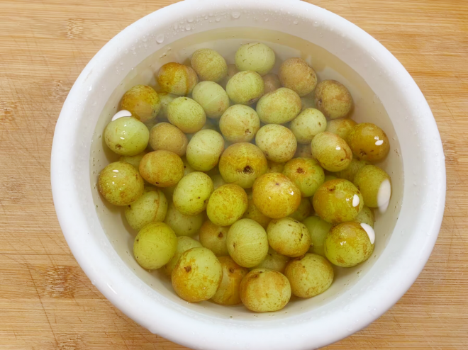 2、油甘果放在案板上,用菜刀拍兩下,把油甘果拍裂,切記不要拍碎,拍碎吃起來口感不好。拍裂的油甘果再放入鍋中煮一下,水開煮10秒鐘即可,煮過的口感更好,同時還能去除油甘果中一些特別的味道。