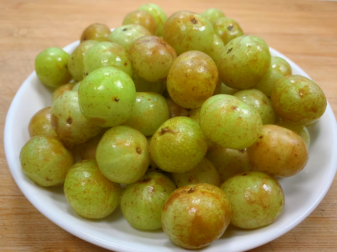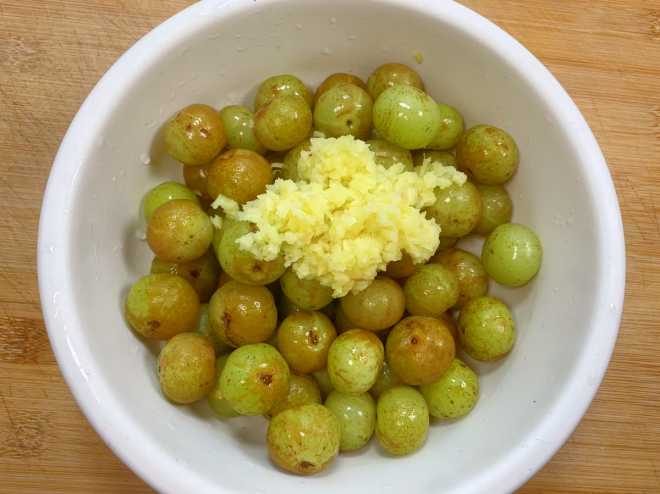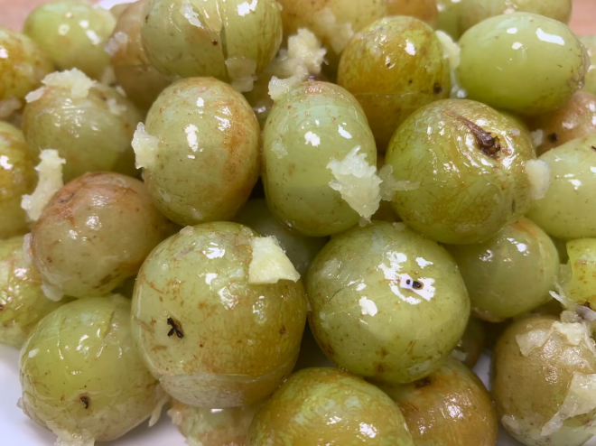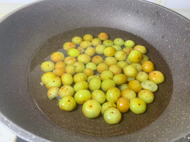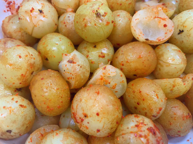 煮熟後的油甘果也可以撒上一些熟辣椒粉,再加入少許鹽,翻拌均勻,可當作下飯菜,口感超棒,超級下飯。