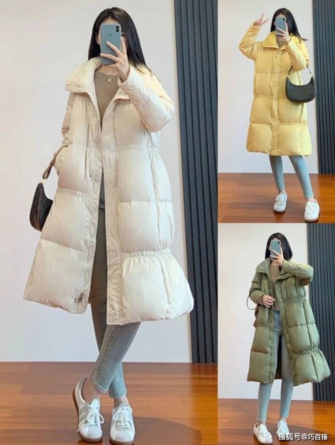 選款技巧一:有設計感的基礎單品一定要碼住,比如博主身上這類高收腰形式的羽絨服。