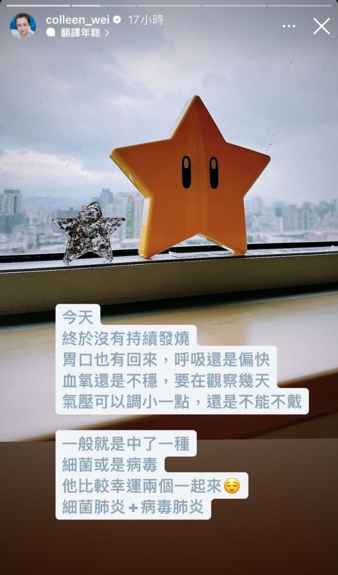 再次度過難熬的兩天,昨日(26日)可藍也更新兒子病況,慶幸兒子終於沒有持續發燒了。胃口也回來了但呼吸還是偏快,血氧依舊不穩、要再觀察幾天,無奈指出一般情況就是中了一種,苦嘆:「他比較幸運兩個一起來,細菌肺炎+病毒肺炎...」氣壓雖然可以調小一點,還是不能不戴,但總歸來說病況有了好轉,也讓她安下心來!