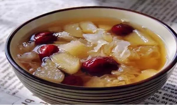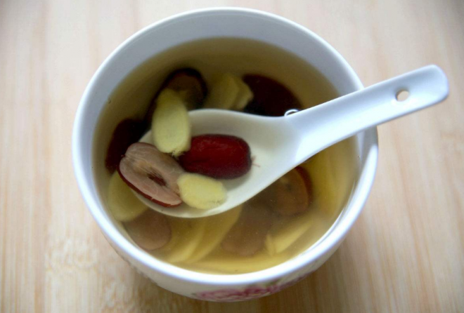 鮮生薑(老薑)3克切薄片,加水500毫升,小火煮20分鐘,再加入紅棗6~10枚,桂圓6~10隻,小火燉到紅棗酥爛,吃紅棗和桂圓,喝湯。如果能加入一點紅糖,那更好。每天睡前吃一次,這種吃法,味道好,營養高,而且效果不錯。