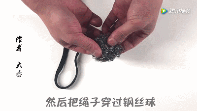 拿一個不要的鋼絲球和一根繩子,將繩子穿在鋼絲球上。