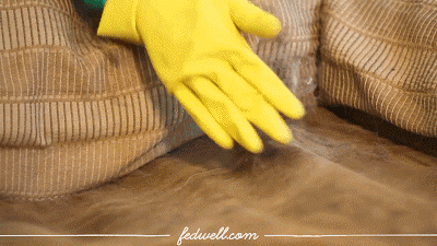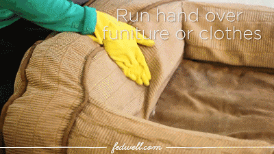 橡膠手套不僅可以打濕水還可以兩隻手來回互搓,產生了靜電後,便可到沙發上「搜集」毛髮了!