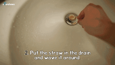 將吸管伸進下水道里轉幾圈,毛髮都纏在吸管上,輕輕一扯,堵塞的頭髮全被扯出來了。