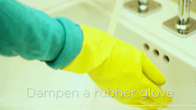 戴一個橡膠手套,把手套放在水龍頭下打濕。