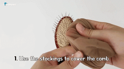 用髮梳梳頭時,可以選擇一條乾淨的絲襪,將其套在髮梳上,讓梳齒穿過絲襪,兩者完全貼合。