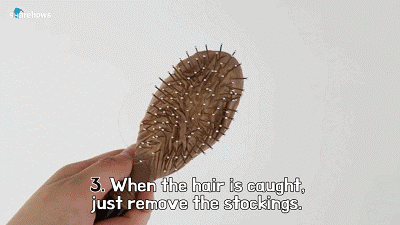 梳完頭髮後,把絲襪取下來,將上面的頭髮抖掉即可。這樣掉的頭髮都黏在絲襪上,根本不會落地。