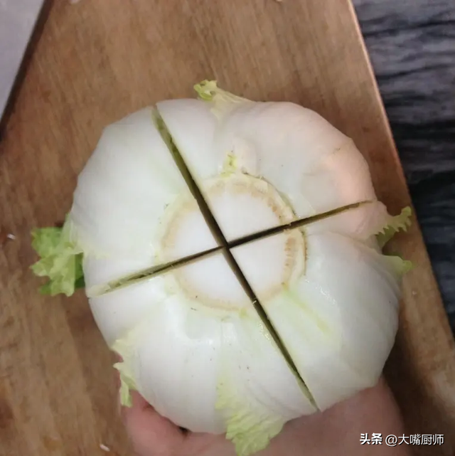 3、把白菜外層的葉子扒掉,裡面就很乾凈了,不要清洗,沾生水後容易腐爛變質。用乾淨的菜刀把白菜一劈四半,切開的白菜更容易醃透,口感更爽脆。