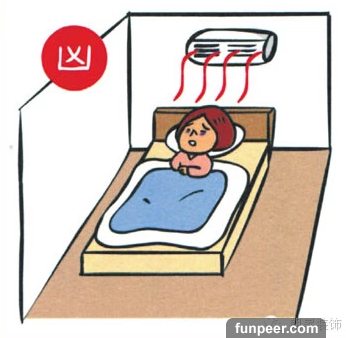 床位安置在空調下方,寒氣不斷吹向頭、肩、頸,