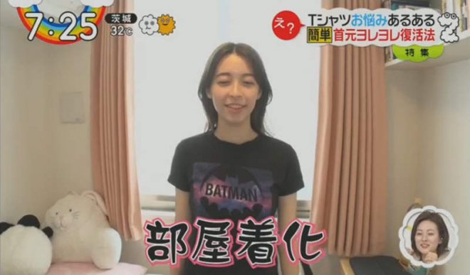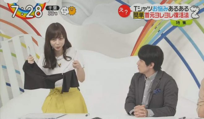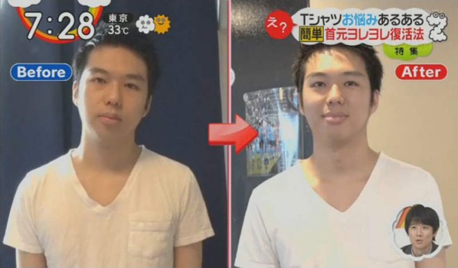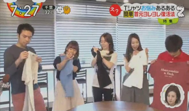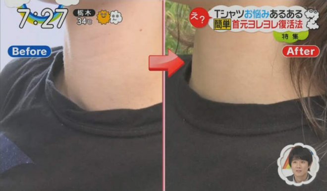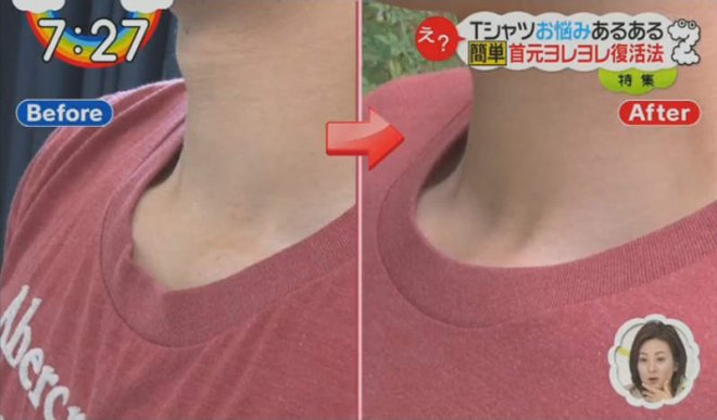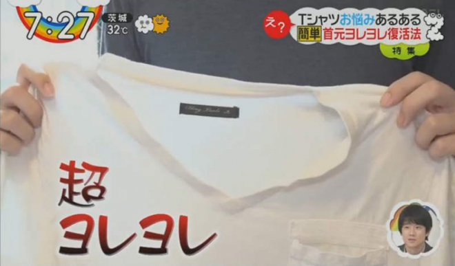 日本節目「 ZIP! 」在街頭訪問路人,許多人都表示自己愛穿T恤,但領口鬆垮的問題都困擾著他們,影片中的男生、就拿出一件鬆垮垮的T恤,直說這是自己的睡衣;另一位女生也說,自己只敢在家裡穿T恤。