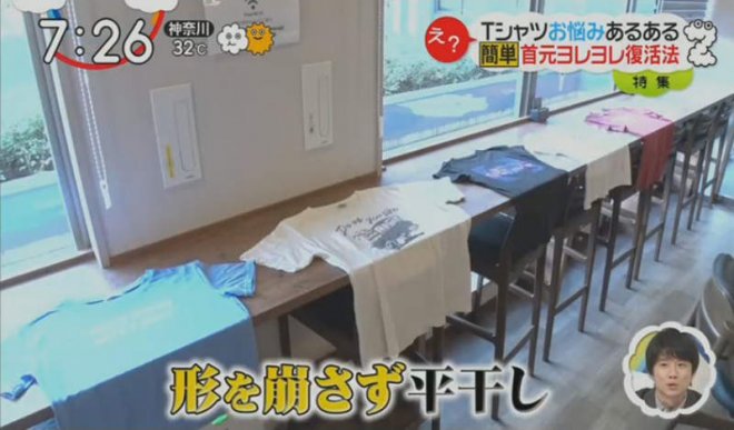 節目組找到洗衣專家「神崎健輔」,他表示T恤的領口之所以會變鬆,是曬衣服環節上出問題,棉質的衣服如果不好好晾曬,很容易就變形,不過大家不用擔心,只要簡單幾個步驟,就可以讓最愛的T恤恢復原樣!