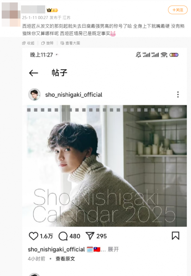 西垣匠最近幾年參與了多部知名劇集,其中BL劇《歡迎光臨自助洗衣店》令他在粉絲中擁有廣泛的支持。這次,他分享的寫真月曆是在台灣拍攝的,並在社交平台上寫道:「這次來到台灣,品嚐美味的食物,欣賞美麗的風景,讓我的心情得到了治癒。2025年,讓我們像一起來台灣旅行一樣度過吧!」然而,貼文中的國旗圖案引發了大陸粉絲的不滿,隨後他已經刪除該圖案。