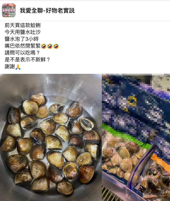 根據《TVBS》報導,一名網友在臉書社團「我愛全聯-好物老實説」上發文,提到很多消費者認為全聯的真空蛤蜊很雷,大方分享吐沙步驟,透露自己為了讓蛤蜊吐沙特地做了功課,直呼:「方法用對,一點都不雷哦!」照著做,蛤蜊不但還是活的,沙子也吐得乾乾淨淨。
