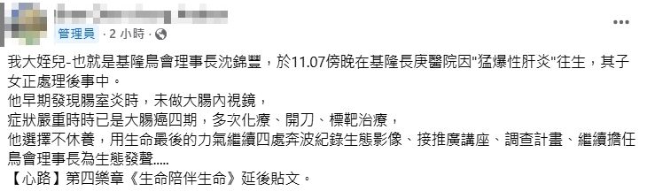 據《ETtoday》報導,基隆的鳥會理事長沈錦豐曾獲得國家教育環境獎,守護黑鳶等其他鳥類長達20多年,驚傳過世的消息,不少生態界的人士得知消息後,都相當錯愕、惋惜。他的家屬在臉書社團發布死訊,表示沈錦豐在昨天(7日)傍晚,因為猛爆性肝炎而過世,而且其實在生前,沈錦豐就因為癌症飽受折磨,歷經多次治療,最後來是因為肺炎而過世,享壽68歲。