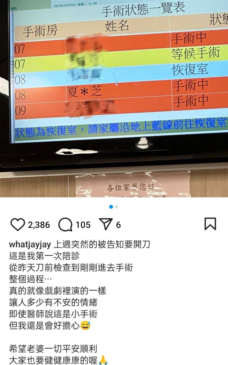 根據《自由時報》報導,男星張捷日前無預警曬出手術狀態表,上面顯示老婆夏如芝的名字,坦言雖然醫生保證是小手術,但他還是好擔心,貼文發出後引起許多網友關心!待術後休息過後,41歲夏如芝透過社群平台報平安,除了向關心她的人表示感謝,也透露了動手術的原因,一直有定期做乳房超音波和X光檢查,這次竟檢查出乳房出現鈣化點,在醫生建議下要做切片檢查。