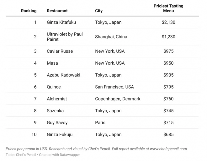 第3名為美國紐約「魚子醬俄羅斯」(Caviar Russe),主打以魚子醬為核心的11道料理,每人費用975美元,被《富比世》形容為「奢華至極的美食漫遊」。第4名則是紐約的壽司名店「Masa」,由高山雅司親自掌舵,頂級食材如松露與奧賽特拉魚子醬成為吸引全球饕客的亮點。