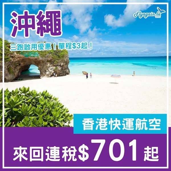 【沖繩】突發!慶祝三跑啟用優惠!香港快運飛沖繩單程$3起,來回連稅$701起!2025年3月29日或之前出發