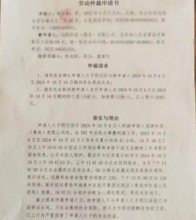 大陸一名39歲刑姓男子,日前被爆出於山東青島某工廠新入職,結果在高強度的加班與工作壓力下,竟於8天後暈倒送醫,後續則搶救不治猝死,讓家屬相當崩潰,捧著遺照到公司門前討回公道。但公司事後的冷血回覆,讓家屬非常不能接受,便將此事爆出,引發社會大眾一片譁然。