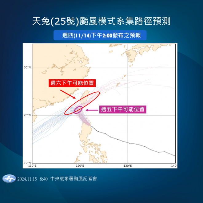 她坦言,秋颱的路徑變化多端,今起至明日清晨的各國分析都趨近一致,但後續轉東北、通過台灣、向西南移動等路徑判斷則各有不同,不確定機率大。而天兔目前卡在西南海面,若結構減弱則會往西南,大致上可確定會影響南部陸地,例如台東、恆春。提及風雨,目前強風暴雨都集中在暴風圈,但強度會隨時間趨弱,「但颱風周圍有較強回波,有明顯降雨,隨颱風逐漸靠近,降雨將會增加,尤其今天下午以後」。