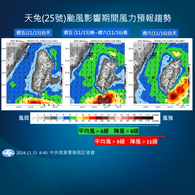 下午起屏東沿海空曠地區及蘭嶼、綠島、澎湖將有8至9級強陣風,晚起恆春半島將有9至10級強陣風。