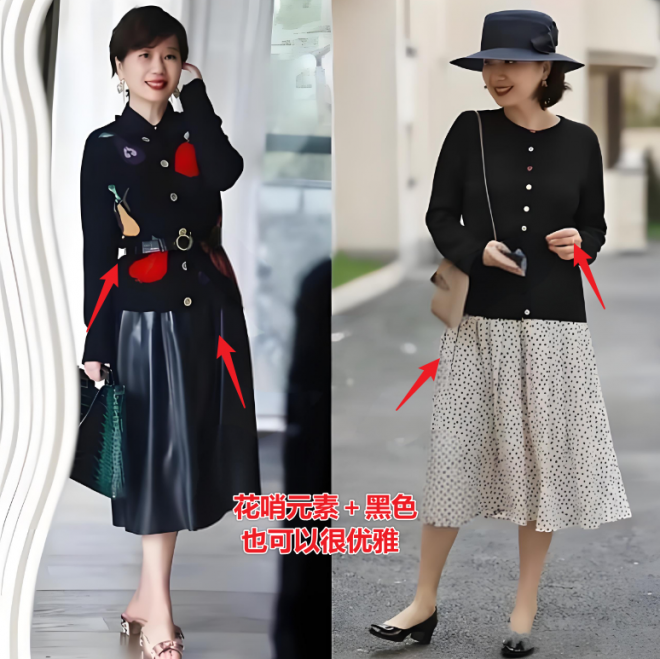同時,黑色本就自帶一種成熟、穩重的腔調,中年女性穿著可能會強化歲月的痕迹,讓你看起來比實際年齡更大。