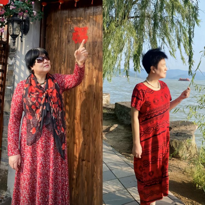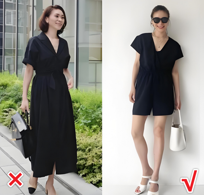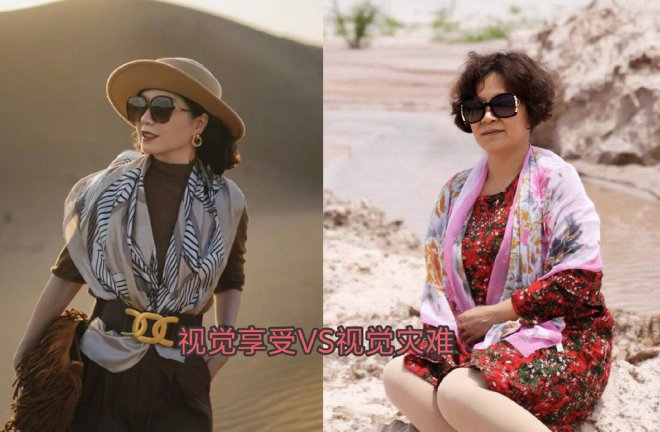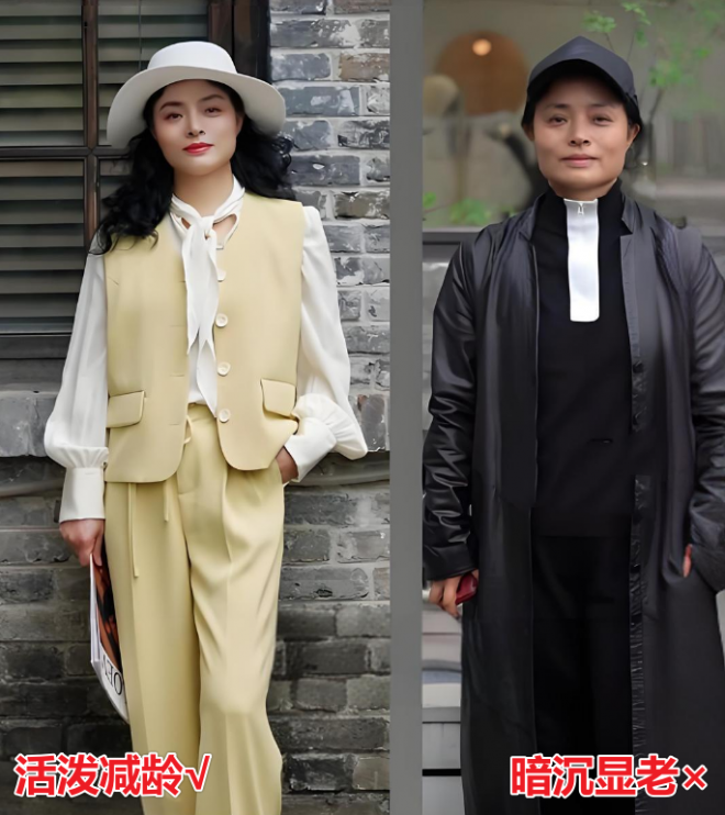 例如下圖這位女士,左右兩邊的對比簡直不像是同一個年齡階段的人,明亮的嫩黃色搭配白色讓她看起來既時尚又活潑,而右邊的黑色穿搭不僅把她的皮膚襯得更黑,看起來還顯得沒有精氣神,透著一股老態。