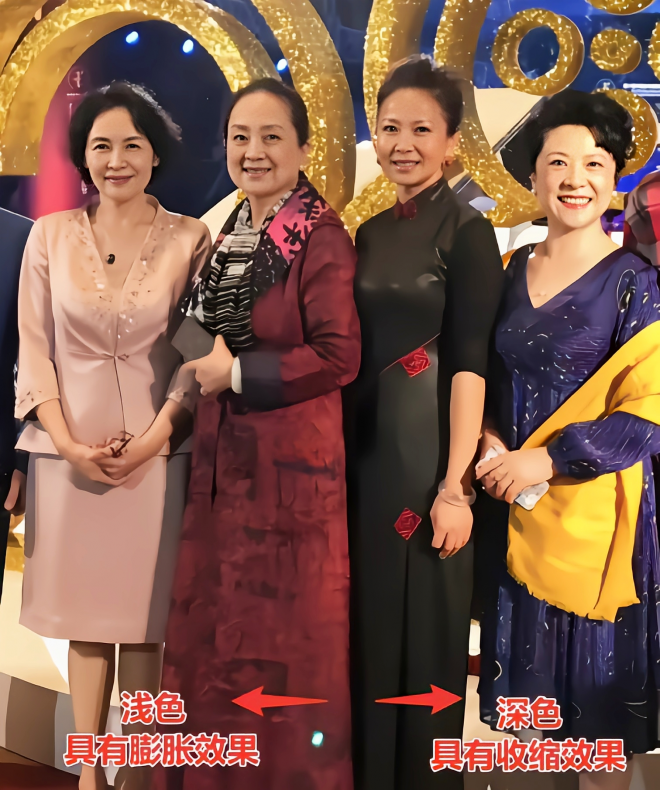例如,對於微胖的王馥荔來說,深色系的色彩通常具有收縮的視覺效果,例如黑色、藍色等,可以視覺顯瘦;而淺色系的色彩則具有擴張的視覺效果,適合用於宋曉英這種瘦削的身材,視覺膨脹以凸顯身材的豐滿和曲線。