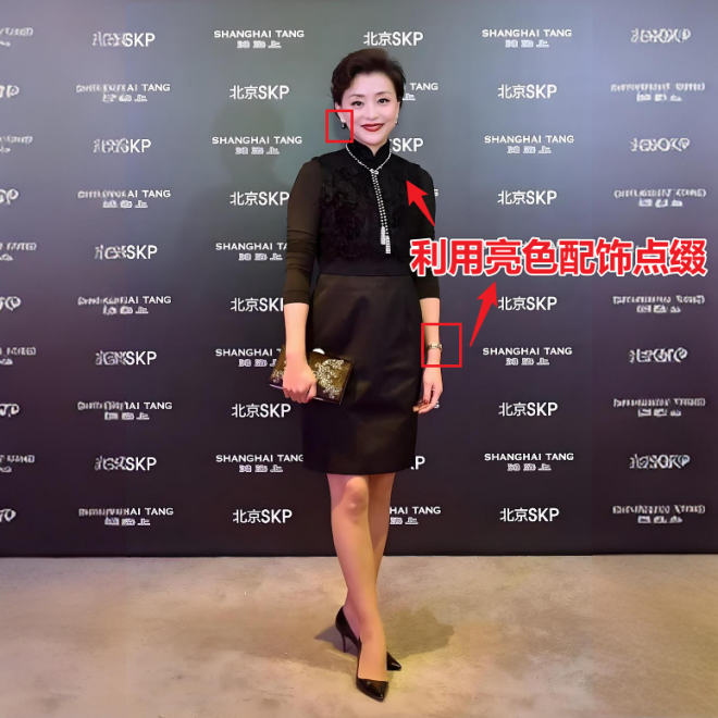 如果是穿全黑的連衣裙或者套裝,最好選擇露膚度較大的款式,用膚色平衡黑色的壓抑,打破黑色的連續性,增加整體的透氣感和輕盈感。