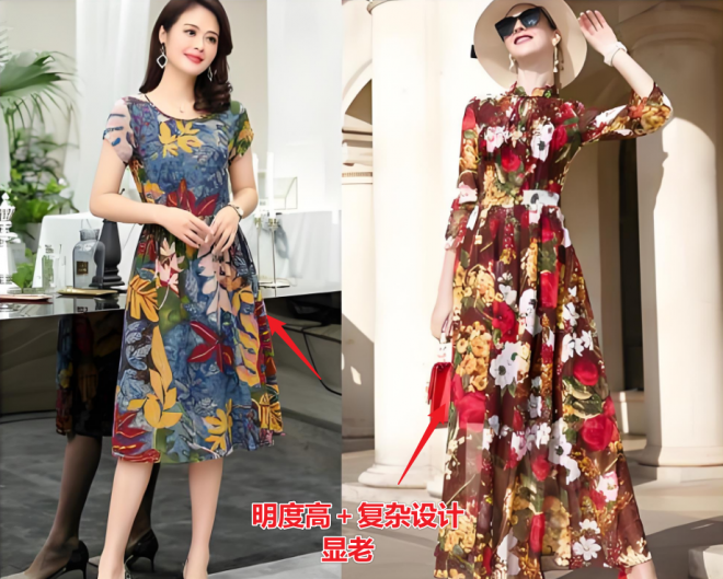 前面我們有提到一點,那就是顏色的明度和複雜度也會影響一個人的視覺年齡,像有些媽媽們穿著的碎花裙,飽和度太高了,色彩斑斕、花色複雜且密集,不僅看起來顯得老氣橫秋,也拉低了一身的氣質以及外界對她們的印象。