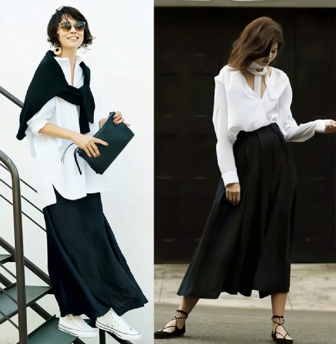 例如下圖這兩種穿搭,左圖的黑色透露著沉穩與嚴肅,讓人不敢輕易接近;而右邊的黑白搭配就顯得活潑許多,氣場也因此變得柔和,更方便社交。