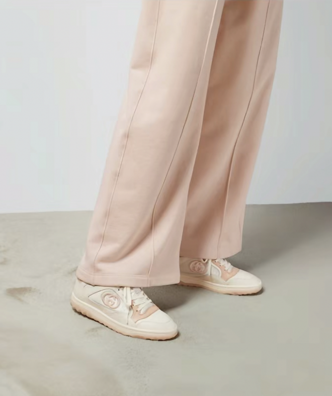 2024春季櫻花粉精品鞋推薦-GUCCI鞋面特意設計成仿舊風格,迎合了當今流行的復古潮流,同時融入了內斂的 Interlocking G 細節,令整體設計更加吸睛。加上搭配減齡的櫻花粉色,讓這雙復古鞋款散發出粉紅色的活力氛圍。即使穿了十年,也看不出歲月的痕跡,再也不用擔心新買的白鞋會很快髒掉XD