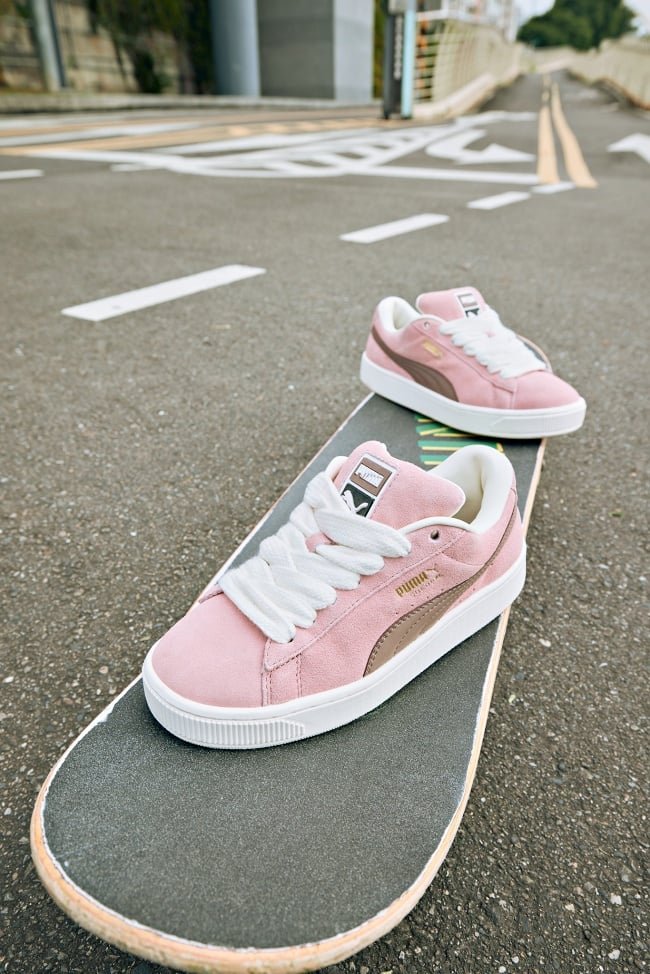2024春季櫻花粉鞋推薦-PUMAPUMA這次將經典的SUEDE鞋款升級為「XL胖版麵包鞋」,鞋舌更厚、鞋帶更寬,加上增厚的鞋底和圓身鞋型,呈現出呆萌又療癒的風格!搭配夢幻的櫻花粉鞋面和奶茶棕彎刀,絕對是一款讓人看了就會心動的鞋款♡麂皮材質、皮製側標和金色LOGO等細節質感十足,更能拉長腿部線條,讓你走在時尚的前沿!