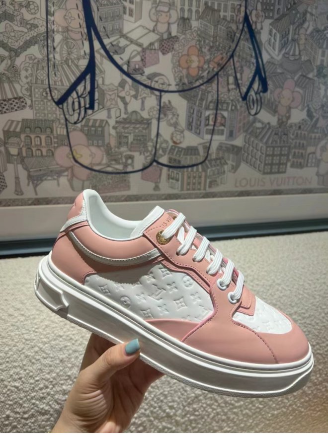 2024春季櫻花粉精品鞋推薦-Louis VuittonLouis Vuitton 的 Time Out 運動鞋將柔軟的小牛皮與迷你Monogram圖案結合,營造出別出心裁的設計~鞋底厚實的橡膠材質上刻有立體的Louis Vuitton標誌,並裝飾著金色鐫刻孔眼等細節,讓整體更顯精緻。此外,微微增高的鞋底設計也非常貼心,對於身材較小的女性也十分友好。