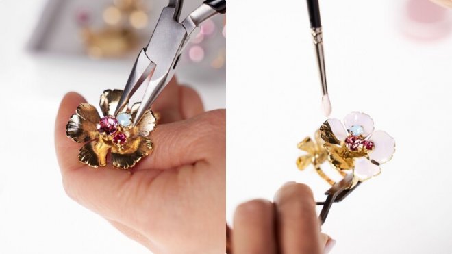 嬌蘭「花冠粉櫻淡香水珠櫻流蘇蜂印瓶」2024年限量的Cherry Blossom高訂櫻花香氛特別邀請法國知名珠寶設計師Philippe Ferrandis合作。他為了香水設計了一只裝飾了兩朵淡粉搪瓷櫻花的戒指,鍍上24K純金,並鑲有晶亮的水晶。最棒的是~這枚戒指還可以拿下來配戴!