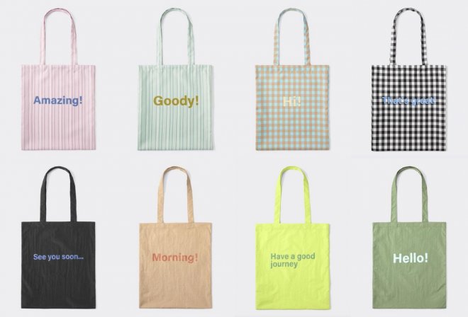 GU 文字托特包在日本推出時大受好評!這款包大小適合裝入A4文件,不同於過去素面造型,還加入了直條紋、格紋等設計。更有趣的是,袋子上還分別印上「Morning!」、「Hello!」、「See you soon…」、「Have a good journey」、「Goody!」、「Amazing!」、「Hi!」、「That"s great!」等招呼語,背上後覺得生活都可愛了起來~