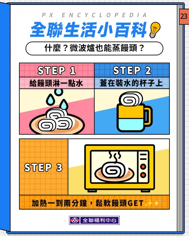 步驟一、先給饅頭淋一點水;步驟二、杯中倒入大約1公分高的水量,再把饅頭置於杯子上方;步驟三、再把饅頭放進微波爐加熱1-2分鐘即可。全聯強調,此時剛加熱完成的鬆軟饅頭吃起來像剛出爐一樣美味,而且包子也適用同理。